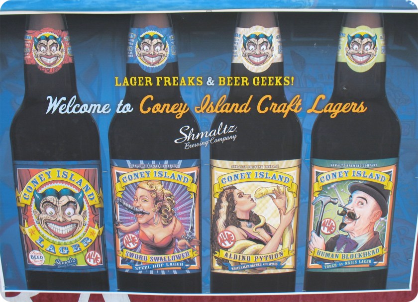 En se rendant vers la plage (il fait sûrement une trentaine de degrés celsius), nous croisons une apeurante machine distributrice à hot-dogs casher (qui fonctionne – hum – sans même un léger bruit de réfrigération…), puis la célèbre Beer Island, où sur un plancher de sable et de tables à parasols, il est possible de déguster les bières Coney Island Craft lagers, aux images de plusieurs freaks bien connus du Circus Sideshow. L’idée de voir un homme à moustache se rentrer un clou dans le nez (et même une perceuse, brrrr…) ne me charme pas particulièrement, mais puisque cette chance unique ne risque pas de se présenter à nouveau, pourquoi pas…