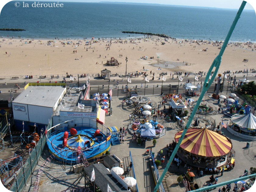 Coney Island, c’est un morceau de poésie américaine situé tout au sud de Brooklyn, où une plage de sable fin (et de quelques morceaux de vitres, ouch!) donne directement sur l’océan Atlantique. Je ne sais plus où mettre la tête dès ma sortie de la bouche du métro, entre les vieux stands de crème glacée, les comptoirs qui mêlent le fast food au blé d’Inde et à la barbe-à-papa, les manèges d’acier peints dans des couleurs vives qui me rappellent « la petite ronde » qui s’arrêtait chaque année dans la cour de l’arèna municipale quand j’étais petite… Mais il y a plus encore; par où commencer?