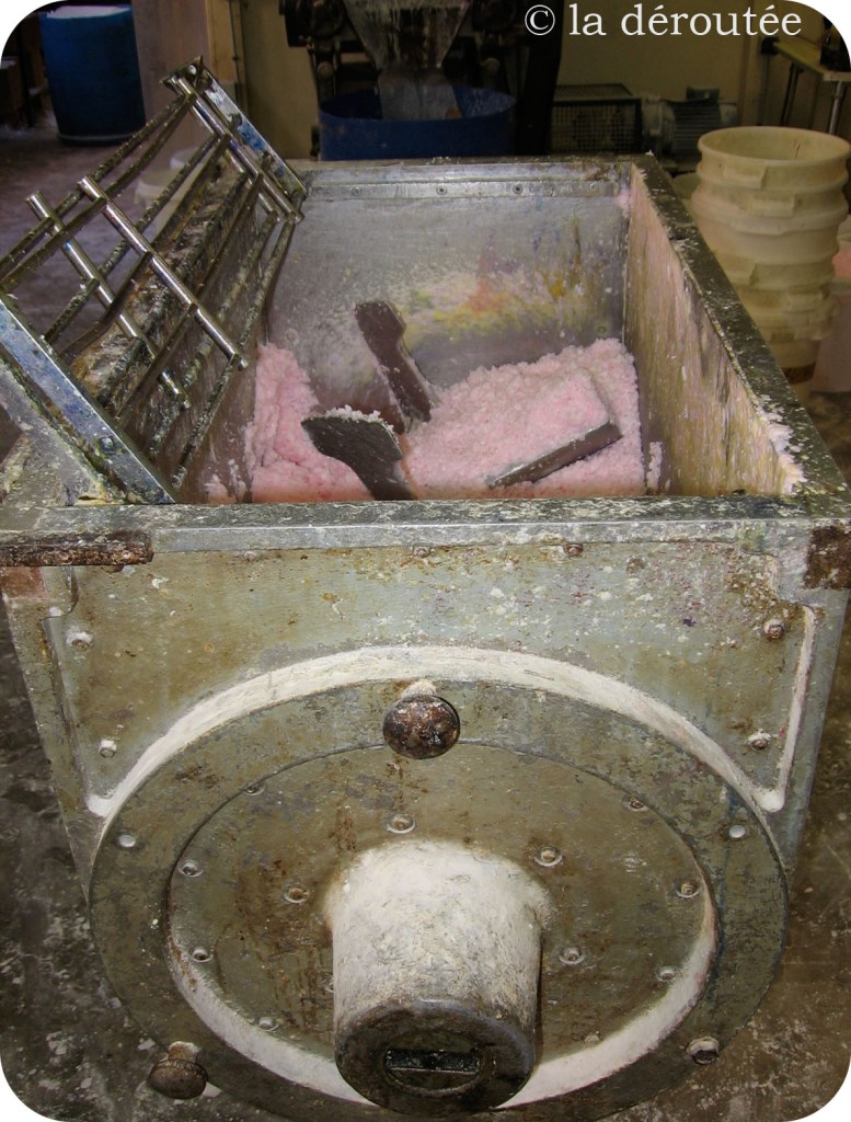 La différence majeure entre la fabrication «maison» du savon et celle en industrie, semble être le degré et la durée de chauffage qui est appliqué au mélange huiles+soude. À la maison, c’est la réaction de la soude dans l’eau, qui sera ensuite mélangée aux huiles et beurres, qui augmente la température du mélange et permet la saponification, alors que l’on brasse vigoureusement à la main (ou à la mixette)… En industrie, la pâte de savon (huiles+soude) est chauffée dans un four ou dans des cuves, ce qui provoque une « lente saponification ». À La Licorne, on nous explique que cette pâte de savon est ensuite broyée en petits copeaux, mélangée aux colorants et huiles essentielles, puis écrasée de nouveau et passée dans une boudineuse (pour ensuite être moulée et estampillée).
