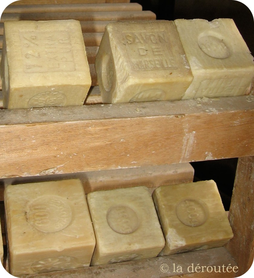 Lors de mon passage (juillet 2008), ils en étaient à leurs premières visites guidées de l’usine, et malgré le fait que notre guide consultait encore ses feuilles de notes, j’ai bien pu sentir et imaginer un veilleur auprès des grandes cuves, un maître-savonnier goûtant au savon, un ouvrier marchant sur le savon de la salle des mises pour le trancher et transportant ensuite les cubes de plus de 30 kg de savon chacun. Évidemment, les temps ont un peu changé; les cuves ne sont plus chauffées au feu de bois et les ouvriers ne transportent plus les énormes blocs de savon grâce à leur force musculaire. Mais le savon de Marseille «72% huile» (huiles végétales d’olive, de coprah et de palme chez Marius Fabre) est fier à sa tradition; suite à l’empâtage ou la saponification entre les huiles et le mélange de soude, la pâte de savon est lavée avec une «lessive de sel» pour éliminer entièrement la soude. Elle est ensuite chauffée à feu doux pendant, au total, une dizaine de jours, ce qui permet de séparer le savon de la glycérine; la pâte est lavée et relavée pour la débarasser de ses impuretés, puis transportée dans la salle des «mises» où elle sèchera, sera coupée puis envoyée à ses dernières étapes de fabrication.