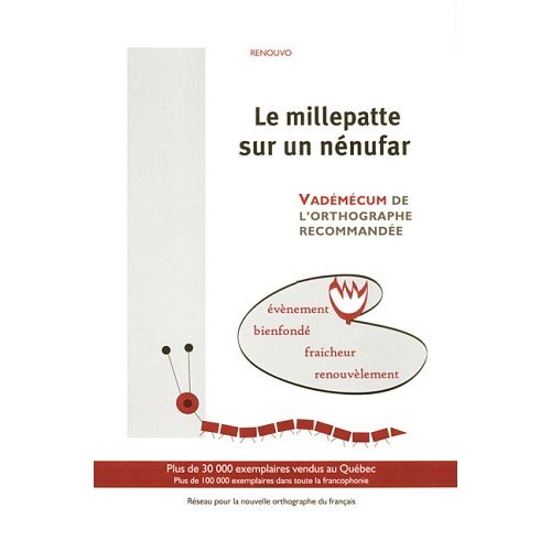 Il y a quelques semaines je me suis « enfin » procurée le Vadémécum de l’orthographe recommandée, mieux connu sous le nom du Millepatte sur un nénufar. Je dis « enfin » parce que je baigne dans les départements de langue française, que ce petit truc existe depuis 2005 et que je ne l’avais pas encore dans ma bibliothèque; et non parce que ça me tentait particulièrement de l’avoir!