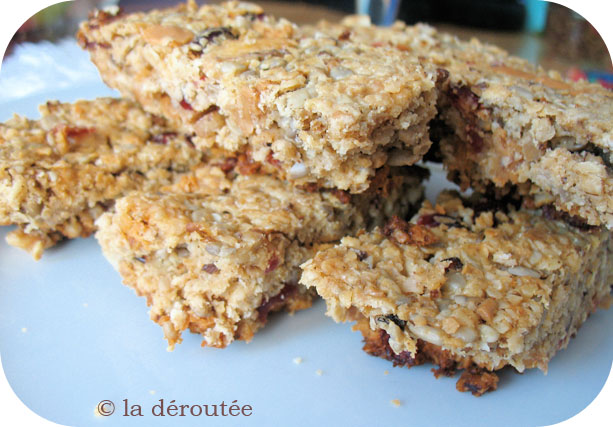 Préchauffer le four à 325°F. Bien mélanger tous les ingrédients à la cuillère (il peut être préférable de préalablement en passer certains au hachoir). Beurrer un grand moule en pyrex ou recouvrir une tôle de papier parchemin (soyez généreux, ça colle!) et bien tasser le mélange au fond; faire cuire environ 30 minutes, laisser refroidir 10 minutes puis couper en barres!