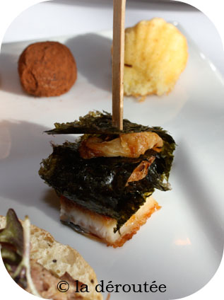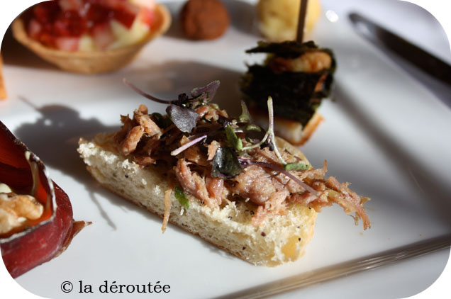 Les thés proposés proviennent de chez Camellia Sinensis et sont tout simplement excellents; les trois que nous avions choisis réussissaient, chacun à leur manière, à s’harmoniser avec les bouchées suggérées. J’ai pour ma part bu le Hochija Shizuoka, un thé vert du Japon; chéri a choisi le Assam Banaspaty, un thé noir indien au goût beaucoup plus prononcé; et Catherine a profité d’un thé indien plus girly, aromatisé à la pomme grenade et au magnolia.