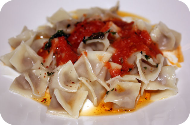 Le Bistro Su propose comme plats principaux une bonne variété de mets à base de viandes (surtout) et de quelques poissons et fruits de mer; nous avons pourtant choisi d’essayer les deux variétés de pâtes farcies qu’il y avait au menu. Mon amie a bien aimé ses piruhi (ci-haut), des raviolis turcs farcis de fromage frais (type feta, très salé) et de persil, avec une sauce crémeuse originale aux noix de Grenoble. J’ai, pour ma part, vraiment ADORÉ mes manti (ci-bas), de jolis raviolis turcs farcis de boeuf et d’herbes, accompagnés d’une sauce au yogourt à l’ail et aux tomates pimentées.