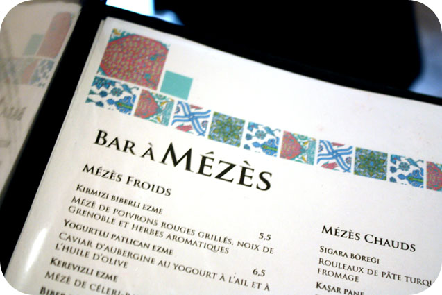 Le Bistro Su nous offre un bar à mézès; on adore! Les mézès sont l’équivalent turc des tapas espagnols: ils regroupent une grande variété de petites bouchées froides ou chaudes, servies à l’apéritif ou comme entrées, à apprécier seul ou à partager entre convives. La tradition turque propose d’accompagner ces petites bouchées d’un verre de raki, un alcool anisé qui ressemble beaucoup au ouzo grec ou même au pastis français. On sert le raki de la même manière que ses frères anisés, en le mélangeant à un peu d’eau et de glace, au goût; celui que j’ai testé m’a semblé plus doux que mes dernières dégustations de ouzo et de pastis, avec une touche de bonbon au caramel en fin de bouche… Essayez-le!