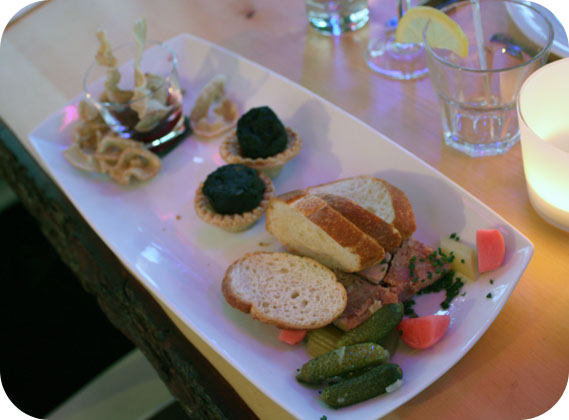 Le premier service arrive enfin; nous sommes affamés! Nous dévorons des oreilles de crisse qui nous sont familières, mais dont le mariage avec une purée de betteraves est rafraîchissant. Les tartelettes de boudin noir et de ketchup aux fruits sont englouties en moins de deux, tout comme les cretons de canard au foie gras! (Je fais une découverte qui influencera sûrement ma prochaine « rage de conserves »: des céleris marinés, c’est vraiment bon!)