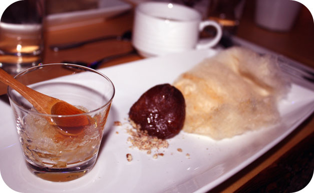 Les trois parties composant le dessert sont excellentes: une bonne quantité de barbe à papa à l’érable, un grand-père dans le sirop réinventé à se rouler par terre, ainsi qu’une cuillère de tire d’érable servie sur un granité à la pomme. Pour notre plus grand plaisir, encore une fois, Danny St-Pierre nous a même offert la recette de ses grands-pères dans le sirop lors d’un autre passage à Curieux Bégin: cliquez ici!