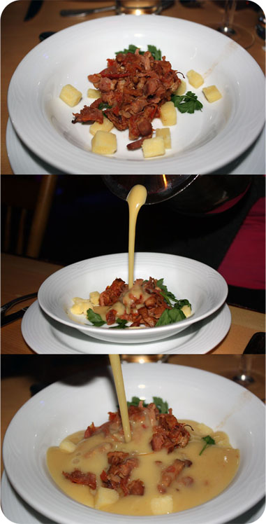 Puis vient le service le plus mémorable de la soirée; tous les foodies s’entendent à ce sujet! La crème de pois cassés au vieux cheddar avec sa salade Lady Lumberjack, inventée par Danny St-Pierre, est un véritable chef-d’oeuvre! Nous versons nous-même l’abondante soupe chaude dans notre bol et à chaque bouchée, le porc effiloché fond dans notre bouche. Lorsque l’on tombe par surprise sur un morceau de cheddar vieilli ramolli, c’est l’extase! Un mets dont nous nous rappellerons longtemps! (Mais que vois-je, serait-ce une variante de cette recette présentée à l’émission Curieux Bégin? À vos fourneaux! )