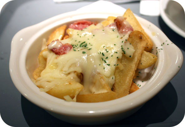 Elle est bonne, cette « poutine » japonaise, vous croyez? À vrai dire, elle est loin d’être mauvaise! Évidemment, elle ne contient pas notre fameux fromage qui fait « squik squik », mais sa sauce barbecue (qui rappelle beaucoup l’assaisonnement BBQ sur nos chips!) est délicieuse, même si elle est peu abondante (on ne la voit d’ailleurs pas du tout sur ma photo)! La version que j’ai essayée contenait en plus de bons petits morceaux de bacon…