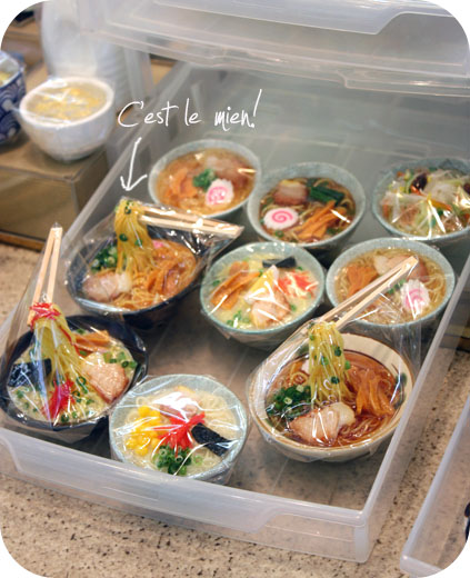 @Charlotte: Oui, une chance qu’ils existent! Pour les étrangers qui ne comprennent pas le japonais, c’est souvent le meilleur moyen d’indiquer notre choix dans les restaurants, puisque les traductions anglaises sont assez rares! C’est drôle, enfin, de réaliser qu’on salive VRAIMENT devant des modèles en plastique!!