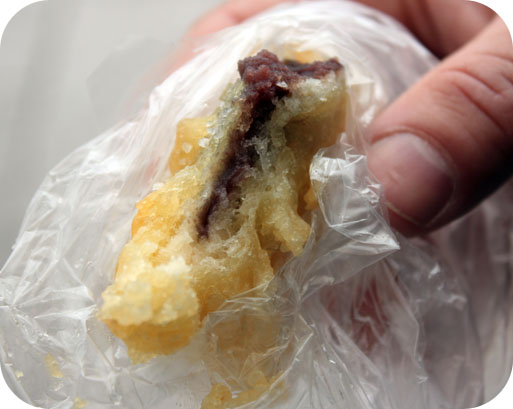 Le petit beignet tout chaud et frit, est notamment composé, au centre, d’une pâte sucrée de fèves rouge azuki (la pâte porte le nom de «anko»), qui a été entourée de plusieurs couches de yuba. La croûte croustillante est salée et l’intérieur, sucré et moelleux. Trop bon!!!