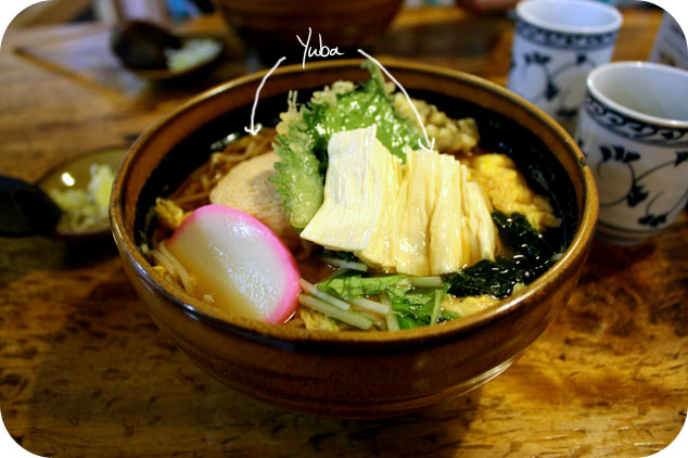 De passage dans la ville de Nikko, il faut absolument goûter à de la peau de tofu ou yuba, qui est la spécialité de la région (pour plus d’informations – en anglais – cliquez ici). Ce n’est pas le goût du yuba qui nous surprend (ça goûte évidemment le tofu), mais plutôt sa texture; la fine peau de tofu glisse sur la langue, un peu comme les algues que l’on nous sert dans les soupes japonaises!