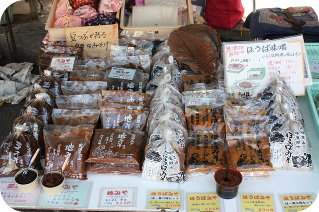Sur une table du marché Miya-gawa, on voit les ingrédients de base qui servent à la préparation du hoba miso: le miso frais et les feuilles de magnolia séchées.