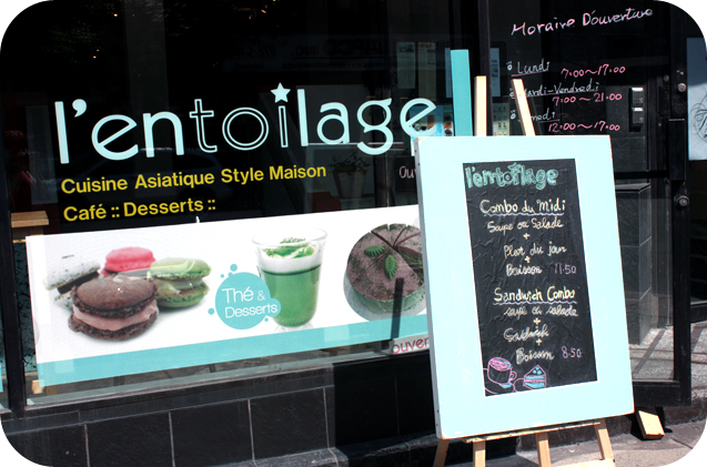 Difficile de décrire ce petit restaurant montréalais qui a ouvert ses portes plus tôt cette année! Chez l’Entoilage (5251 Saint-Laurent), on nous reçoit dans une ambiance cafétéria et un décor blanc et turquoise, agrémenté de tableaux et de meubles qui ont l’air d’avoir été dénichés dans une vente de garage des années 80/90… On trouve ça un peu bizarre, mais on ose!
