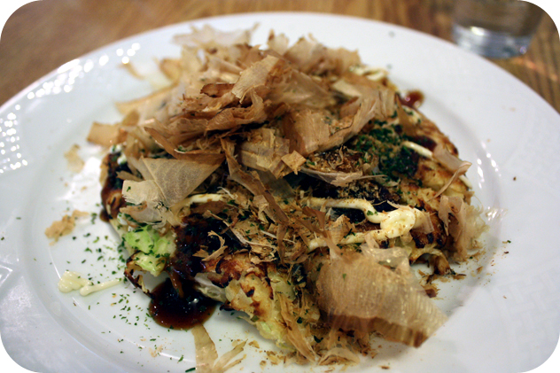 J’avais hâte d’essayer ce nouveau restaurant japonais, entre autres parce que j’avais entendu dire qu’on y servait, pour la toute première fois à Montréal, l’okonomiyaki. Même si leur version de cette «crêpe au chou» est loin d’être aussi bonne que celles que nous avons mangées à Osaka, j’ai apprécié l’audace de l’avoir mise au menu. (Le défaut majeur, à mon avis, c’est la trop grande quantité de bonite séchée!)