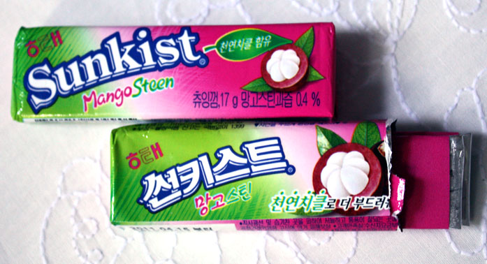 Par contre, à l’aéroport Incheon de Séoul, mon amoureux m’a trouvé un produit intéressant fait par Sunkist: une gomme au mangoustan! La saveur y est évidement caricaturée, mais c’est bon et rafraîchissant; une belle curiosité!