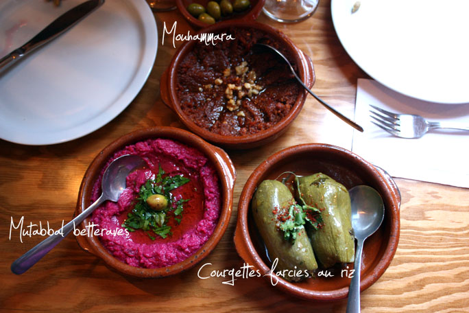 Je ne connais pas vraiment la cuisine syrienne, mais dès que j’ouvre le menu, je suis déjà conquise par cette formule de mezzes (ou tapas) qui est proposée dans plusieurs restaurants de cuisine du monde. À deux, comme on connaît déjà l’hummus, le baba ghannouj et le labneh, on choisit de partager des entrées froides qui nous sont inconnues, comme du mouhammara (une purée de poivre d’Alep, de noix de grenoble et de noix de pin, de chapelure, de mélasse de grenadine et d’huile d’olive) et un muttabal betteraves (une purée de betteraves, tahini, yogourt, citron, ail, persil et huile d’olive), que l’on tartine sur du pain pita, ainsi que des courgettes farcies au riz, légumes, noix de pin et raisins de Corinthe. Les trois mezzes, vraiment réussis, s’équilibrent très bien entre eux (et s’harmonisent avec notre vin rouge libanais) – ça nous donne envie de s’en refaire, en conserves, à la maison! (Vite, je cours fouiller dans mon livre Saveurs d’Alep!)