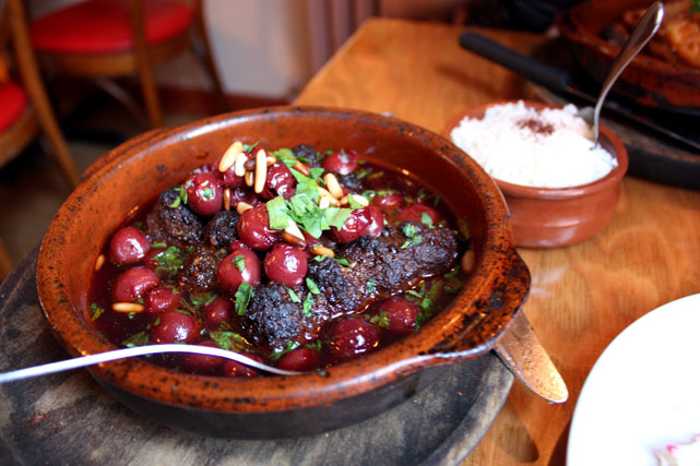 Je me serais contentée de ces mezzes froids comme repas, mais j’avais trop envie de prolonger le plaisir et d’essayer quelque chose d’autre! Mon choix s’arrête sur le kabab bil karaz: des boulettes d’agneau hachées puis grillées, mijotées avec des cerises griottes et des noix de pin. Je ne raffole pas de la viande d’agneau en général, mais c’est probablement l’un des meilleurs plats d’agneau que j’ai mangé jusqu’à maintenant; j’en veux encore! Mon amie a, pour sa part, été plus déçue de son poulet à l’ail, avec sauce au citron et poivre d’Alep, qu’elle a trouvé un peu trop sec.