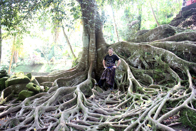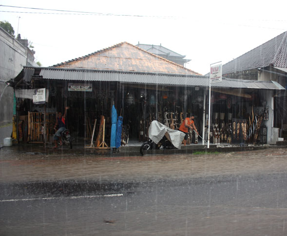 On discute de tout et de rien pendant près d’une demi-heure avec un sympathique jeune guide de l’endroit, heureux de pouvoir pratiquer son anglais avec nous! Son collègue prend plaisir à emprunter notre caméra, puisqu’il adore prendre des photos. On doit finalement partir, puisqu’il se fait tard et que nous avons une réservation pour souper. Il faudra trouver des imperméables en cours de route parce que c’est le déluge; la route descend vers Ubud, l’eau aussi, et on patauge en scooter dans un demi-pied d’eau… mémorable!