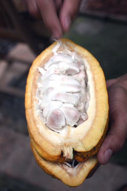 Sur place, on goûte à du cacao frais! C’est surprenant; on dirait plutôt une noix très douce, avec un minime rappel de cacao dans le beurre blanc qui l’entoure!