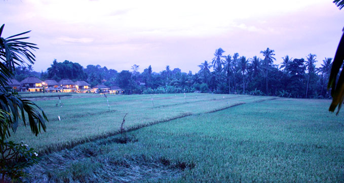 Vue sur les rizières, au coucher du soleil, assis à notre table au restaurant Bebek Bengil.