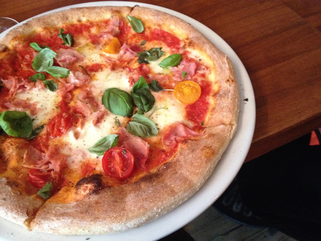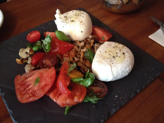 Lors de notre passage, nous avons choisi, à trois, de partager en entrée une portion de burrata (cette fameuse coquille de mozzarelle solide contenant un mélange de crème et de mozzarelle au lait de vache) et une portion de mozzarella di bufala affumicata (à base de lait de bufflonne, cette fois, et fumée naturellement sur place), et de les accompagner d’une salade de tomates et basilic et de champignons marinés. La prochaine fois, en extras, je me laisserai sûrement tenter par les tomates semi-séchées et fumées maison et par un peu de viande, comme de la saucisse de porc séchée et piquante ou le trio de porchetta maison. Comme repas principal, j’ai trouvé ma pizza bonne et clairement faite avec de bons ingrédients, mais sa croûte me semblait trop molle, comme s’il lui manquait le petit quelque chose qu’est supposé apporter la cuisson au four à bois.