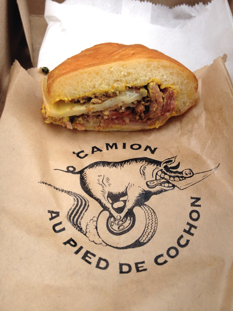 Le désormais célèbre «Beigne cochon» du camion Au Pied de Cochon : smoked meat de porc, langue de porc, jambon blanc, extra fromage, servi dans un beigne