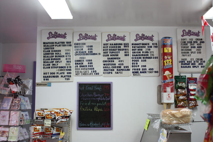 Le restaurant Lafiouk, qui est situé directement sur la Route 11, est une toute petite cuisine familiale. Sa décoration aux teintes de rose et de lilas, agrémentée de fleurs de tissus, ne semble pas avoir changé depuis plusieurs décennies. Au menu, on trouve des classiques de casse-croûte à manger sur place (il y a quelques tables) ou pour emporter, mais on doit s’y arrêter surtout pour les spécialités acadiennes. (En passant, on y sert à la fois de la poutine râpée et de la patachou, qui ressemble davantage à la poutine québécoise.)