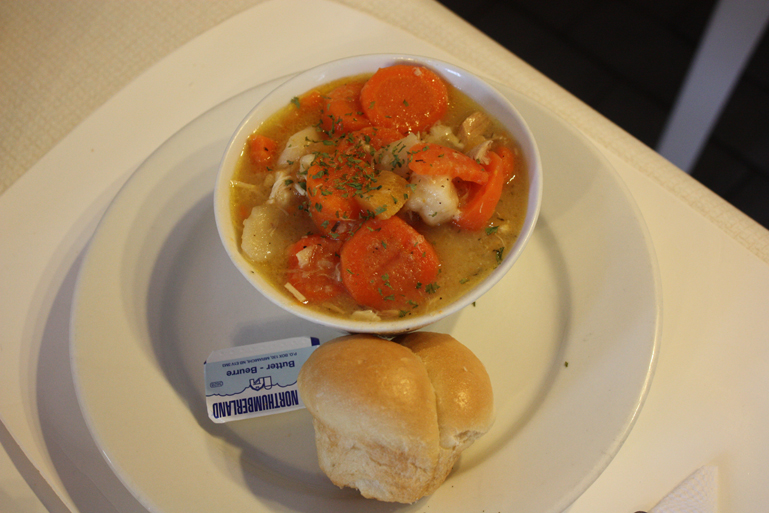 Sur place, j’en ai profité pour commander un fricot, un bol que j’ai vraiment apprécié, probablement puisqu’il me rappelait la cuisine de ma mère. À l’automne, ma maman prépare parfois ce qu’elle appelle un «bouilli» (une recette qu’elle tient de mon arrière-grand-mère): un énorme chaudron de bouillon contenant tout plein de légumes comme des carottes, des oignons, des navets et des pommes de terres, qui cuisent lentement et longtemps, en prenant la saveur des cubes de bœuf qui les accompagnent. Le fricot acadien a aussi quelque chose de cela, puisqu’il s’agit d’une soupe de pommes de terre (et d’autres légumes) à base de viande, qui mijote longtemps, mais qui contient souvent, en plus, des petites pâtes (qu’on appelle aussi «grands-pères» ou, encore une fois, des «poutines» ou «poutines blanches») que l’on fait en mélangeant de la farine, du sel, de la poudre à pâte et de l’eau, et que l’on pré-coupe ou dépose par cuillérées dans le bouillon pour les faire cuire.