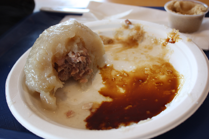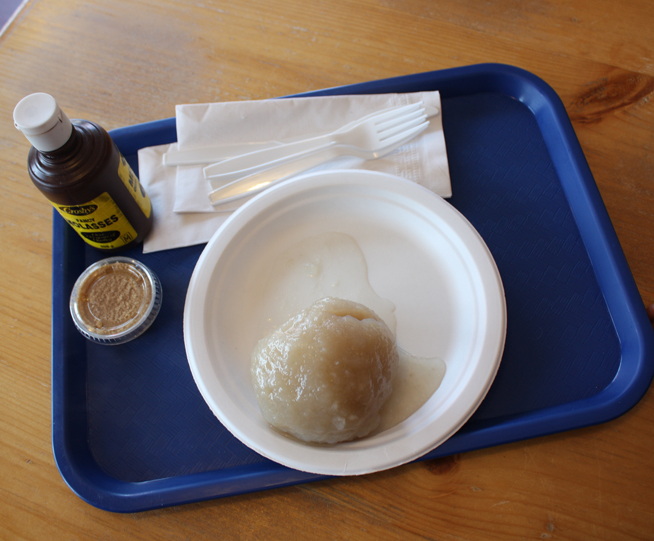 Je m’en doutais un peu: l’apparence visqueuse et grisâtre du plat a particulièrement découragé chéri et petit homme d’en manger plus d’une bouchée, mais je n’ai, pour ma part, pas détesté cette découverte. Lorsque le porc que contient la poutine râpée est bien assaisonné, le plat est plus goûteux qu’il peut en avoir l’air. Le restaurant était visiblement rempli de gens du coin et l’un d’eux m’a tout de suite suggéré d’accompagner ma toute première poutine râpée de mélasse et de cassonade, ce que j’ai fait sans hésiter.