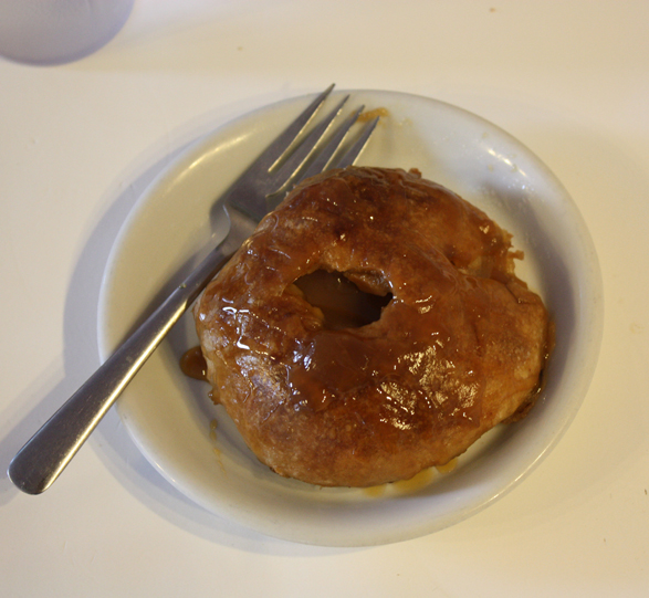 La poutine à trou m’a, je dois l’avouer, un peu plus séduite que la poutine râpée. Il s’agit en fait d’une tarte que l’on façonne en forme de boule (on referme la pâte sur la garniture, on renverse le tout et on perfore le dessus) et qui contient habituellement des pommes, des raisins secs et des canneberges, ainsi qu’un sirop à base de cassonade. Le résultat est sucré, onctueux et réconfortant.