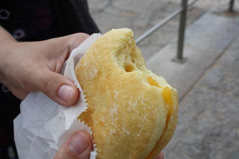 Si nous avons d’abord pris le train vers l’ouest de Lisbonne, aujourd’hui, pour aller se reposer les pieds dans le sable, nous ignorions que nous allions du même coup pouvoir profiter d’une autre belle tradition sucrée portugaise: les Bolas de Berlim. Ce sont des beignes frits à base de pâte briochée, saupoudrés de sucre, que l’on choisi avec ou sans crème, et qui sont vendus dans les pastelarias, mais aussi par des vendeurs ambulants sur le bord des plages, en été, un peu partout au Portugal.